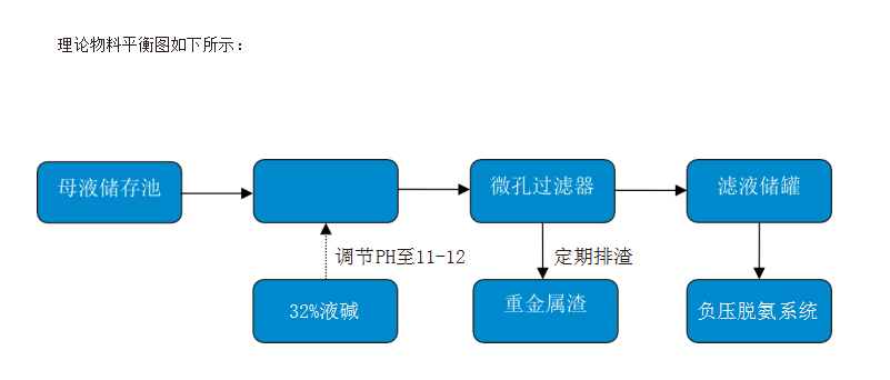 電池材料生產(chǎn)廢水中,母液離子態(tài)重金屬含量比較高,一般pH值低于12,在本類型廢水中,據(jù)我司以往工程經(jīng)驗,當廢水采用氫氧化鈉調(diào)節(jié)pH值至12.5左右的情況下,廢水中大部分重金屬可生成氫氧化物沉淀析出,廢水經(jīng)過沉淀過濾以后,重金屬含量可低于1ppm,并且得到較純凈的重金屬氫氧化物沉淀,可回用于生產(chǎn),同時可延長汽提塔結(jié)垢的周期,因此在此擬采用沉淀法作為母液的預處理工藝。關于沉淀物過濾采用高過濾精度微孔過濾器,其具有過濾效果好,出渣方便的特點。