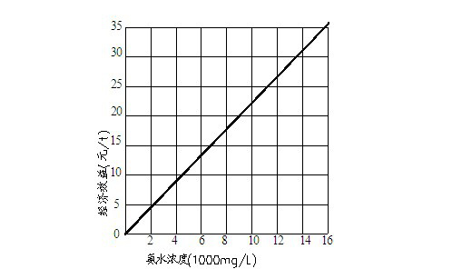 從高濃度氨氮廢水中脫出來(lái)的氨氣通過(guò)吸收塔吸收后,可回收18%以上濃度的氨水,有一定的經(jīng)濟(jì)效益,廢水中氨氮濃度越高,效益越明顯。18%濃度的氨水單價(jià)為600元/噸(市售價(jià)800元/噸)。如果脫氮率按95%計(jì)(實(shí)際能達(dá)到99%),氨的回收率按85%計(jì)(實(shí)際能達(dá)到90%以上),那么處理不同氨氮濃度的廢水,所產(chǎn)生的經(jīng)濟(jì)效益如圖所示。