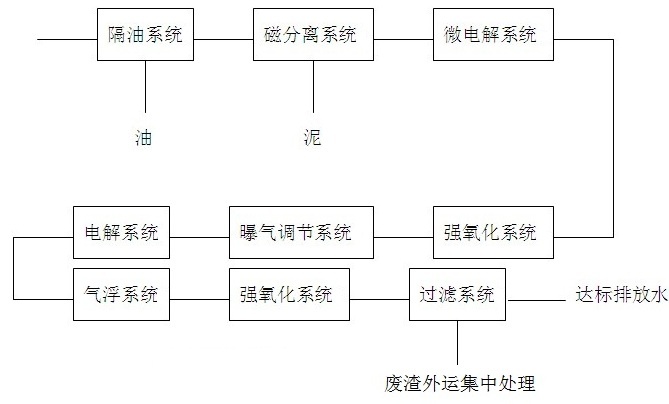 鉆井污泥漿經(jīng)泥漿泵吸入,通過隔油池隔油后,泵入磁分離系統(tǒng),進入磁分離機的泥漿分別經(jīng)過各攪拌桶,分別加入混凝劑、絮凝劑、磁助劑。攪拌后進入磁分離機的主機,磁分離部分分離,通過壓泥機后,污泥排出機外,可裝袋,也可裝入鐵箱,外運填埋;污水進入調(diào)節(jié)池加酸,調(diào)PH值至2.5~3,泵入微電解池,在微曝氣的情況下電解3小時,PH≈5左右,進入斜板沉淀池,沉淀后的廢水加酸調(diào)PH值后,進入強氧化池,在強氧化池加強氧化劑、催化劑攪拌后進入反應(yīng)階段,為了充分反應(yīng),延長反應(yīng)時間,強氧化池設(shè)計成迷宮式,出水泵入曝氣調(diào)節(jié)池,曝氣調(diào)節(jié)池配置有PH自動測控儀和自動加堿裝置,自動加混凝劑裝置,在潛水曝氣機的攪拌下將PH值調(diào)到6.5左右。羅茨風(fēng)機通過潛水曝氣機連續(xù)曝氣充氧,水中的二價鐵離子變成三價鐵離子。曝氣后的廢水進入中間水池1,上清液泵入電解槽電解,中國的石油以烴類為主,以直長鏈及環(huán)鏈狀的形態(tài)存在,通過電解,直長鏈與環(huán)鏈狀被打斷,可被后續(xù)的氣浮刮渣去除;重金屬,電解如用鋁極板,在PH=4~8的范圍內(nèi),Cu,Zn和Cr(Ⅵ)均可有效去除;采用鐵極板作為陽極板,溶解產(chǎn)生的二價鐵離子還原為三價鐵離子,將二價鉻變成三價鉻,隨著電解過程的進行,廢水中氫離子逐漸減少,結(jié)果使廢水堿性增強,在堿性條件下,三價鉻和三價鐵以氫氧化鉻和氫氧化鐵的形式沉淀下來。